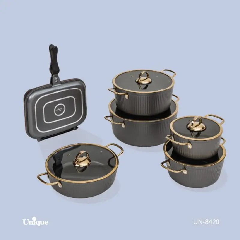 سرویس قابلمه ۱۲ پارچه یونیک مدل UN-8420، با نام فلورانس، مجموعهای کامل و باکیفیت برای پخت و پز روزمره و مجلسی است. این سرویس با بدنه چدنی مستحکم و پوشش داخلی گرانیتی (یا تفلون مرغوب)، ترکیبی از زیبایی، دوام و عملکرد عالی را ارائه میدهد. طراحی شیک و رنگبندی جذاب آن، این سرویس را به گزینهای ایدهآل برای جهیزیه و آشپزخانههای مدرن تبدیل کرده است.